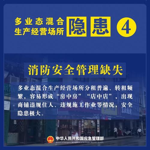 多业态混合生产经营场所 暗藏着诸多消防安全隐患 如有不慎 极易造成重大事故 ↓↓↓ 什么是多业态混合生产经营场所? 多业态混合生产经营场所包括 集餐饮、住宿、娱乐、商业、仓储、文化、体育、培训等 多业态多功能于一体的经营场所 分租、转租形成生产、储存多种功能的 劳动密集型企业等场所 多业态混合生产经营场所 有哪些隐患? 如何治理火灾隐患? 预防一定要做好! 多业态混合生产经营场所安全指南请收好! ...