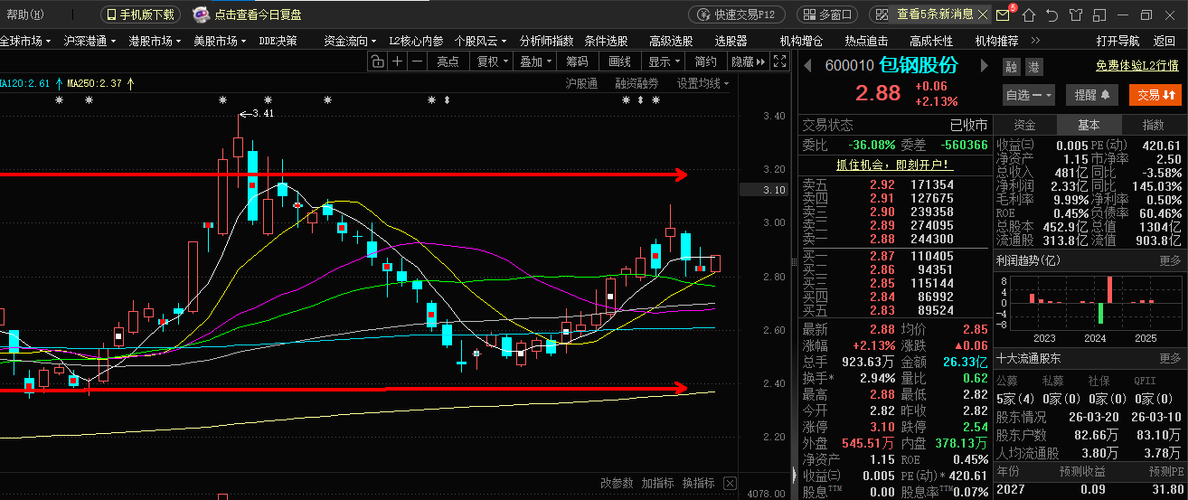 包钢今天走势很稳,底部很扎实。预测明天上冲3.00,能不能突破都会去冲一下。