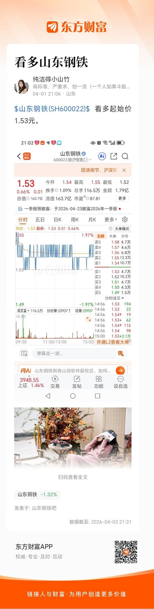 $山东钢铁(SH600022)$又来一个宝刚老大,宝物系的,前走毛,后来郭,他们就是说,有厚道山东半岛人民获得最新发展,打造完美钢跌自留地,有中央知乎资源支持,应该山东钢跌股价上涨趋势开始?还是继续努力韭菜鸡蛋馅儿卷大饼?武大郎炊饼全球销量第一?大家一起来关注研究并发布看法!