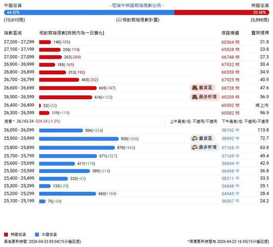 截至4月23日,恒指最新的牛熊街货比例为64:36。截至4月23日,恒指最新的牛熊街货比例为64:36。 中信证券牛熊证街货分布图中的数据显示,熊证重货区在26600-26699区间,该区间最新熊证数量为665张,较上一交易日减少147张;熊证街货最多新增在26500-26599区间,该区间最新熊证数量为616张,较上一交易日增加123张。 牛证街货重货区在25900-25999区间,该区间最新牛...