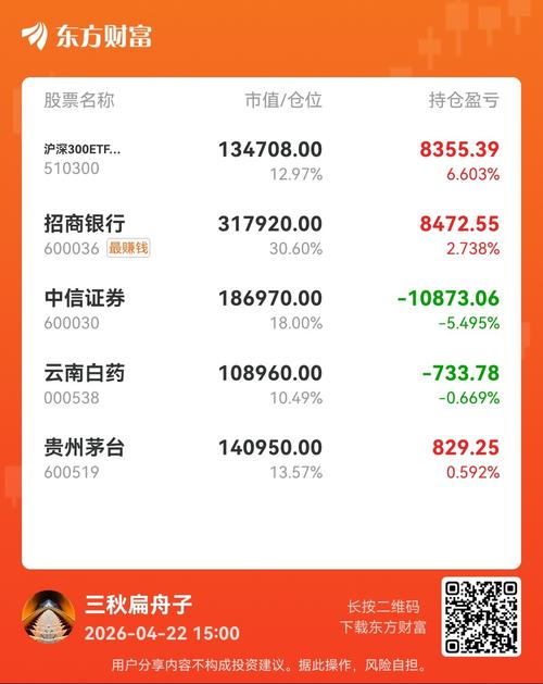 #社区牛人计划##炒股日记# 今日小盈1399元,+0.13%,跑输大盘,中信证券回了点血,沪深300一直较平稳,白药可惜由盈转亏。总体还是不错,毕竟红的。