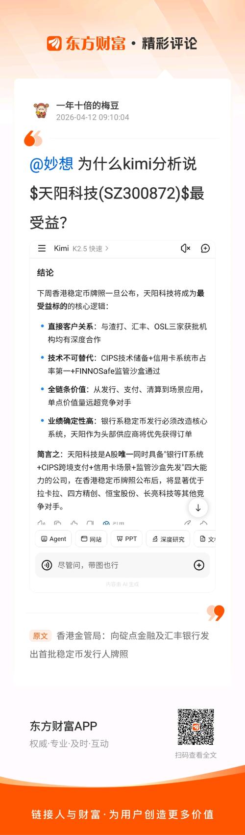 $中信证券(SH600030)$//@一年十倍的梅豆:@妙想为什么kimi分析说$天阳科技(SZ300872)$最受益?