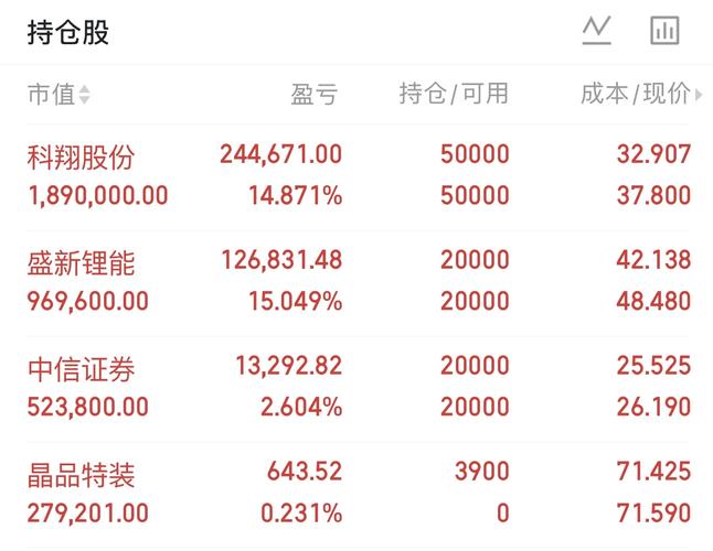 $盛新锂能(SZ002240)$走势极为强势,是账户盈利的重要贡献来源。盛新锂能属于锂矿/新能源赛道标的,受益于锂价回暖、新能源产业链景气度修复,股价走出独立上行行情。 $中信证券(SH600030)$属于防御性持仓。券商板块通常与大盘行情高度绑定,当前小幅盈利,体现了市场情绪的温和回暖。 $科翔股份(SZ300903)$走势强于大盘,属于盈利核心标的。从技术面看,股价突破成本区间后持续上行,当前...