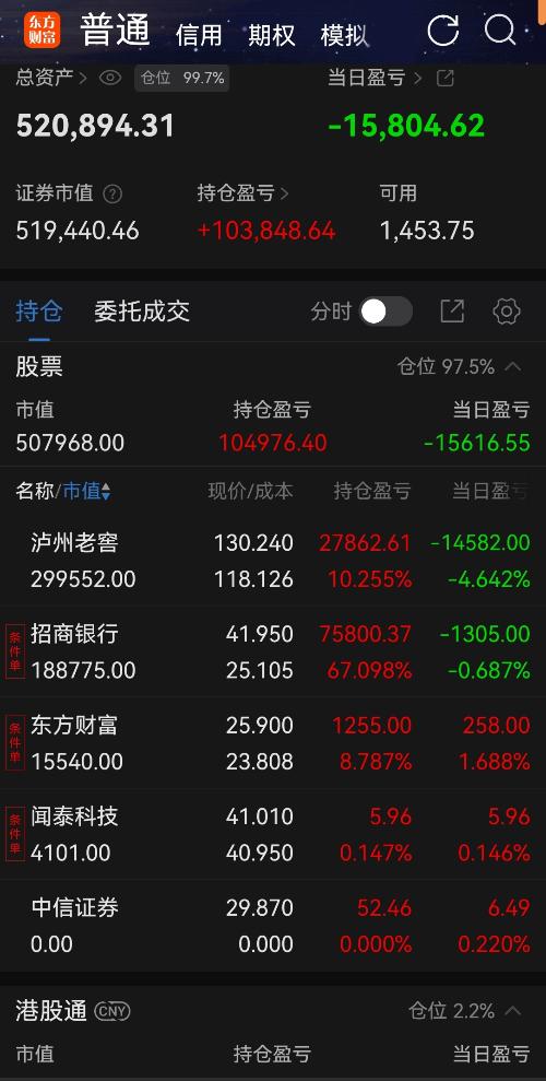 今天浮亏1.58万元,做了两笔操作,其他的保持不变。 $泸州老窖(SZ000568)$ $招商银行(SH600036)$ $东方财富(SZ300059)$