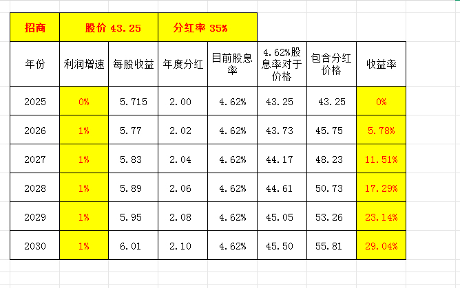 $招商银行(SH600036)$首先招商银行核充14%,基本上可以做到永续经营不需要融资。招商银行目前股价43.25元,股息率4.62%左右,假定未来5年股息率维持4.62%不变,估值不变,分红率按照35%计算。业绩26年~30年都是按照1%增速计算,那么未来5年的收益率分别是26年5.78%,27年11.51%,28年17.29%,29年23.14%,30年29.04%。也就是现在买入招商银行1...