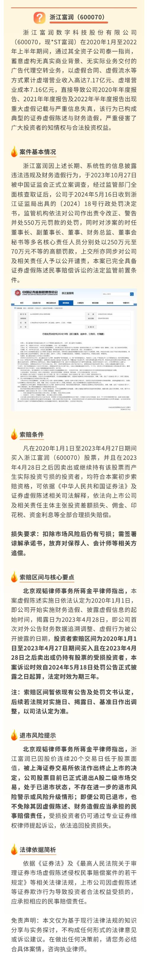 $*ST富润(SH600070)$浙江富润因全资子公司泰一指尚虚构广告代理业务,导致2020年年报、2021年年报及2022年半年报存在虚假记载(虚增营收超7亿元),于2024年5月17日被证监会正式行政处罚(警告并罚款550万元)。凡于2021年4月27日至2023年4月27日期间买入浙江富润股票,并在2023年4月28日(含)后卖出或继续持有的亏损投资者,均可依法索赔。 目前,该案已取得重大进...
