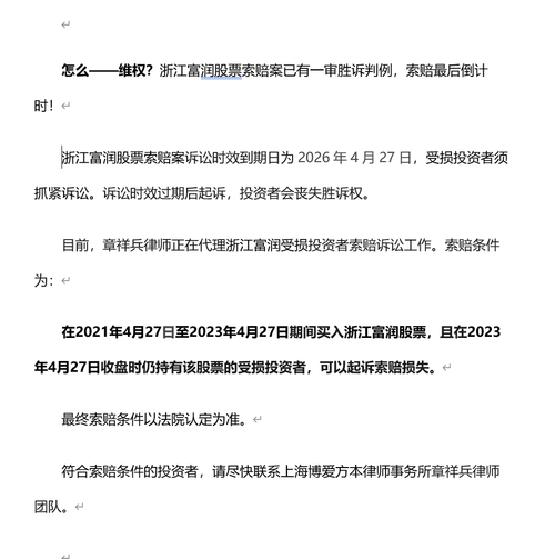 怎么——维权?诉讼时效倒计时!浙江富润股票索赔案已有胜诉判例。 目前,章祥兵律师正在代理浙江富润受损投资者索赔诉讼工作。索赔条件为:在2021年4月27日至2023年4月27日期间买入浙江富润股票,且在2023年4月27日收盘时仍持有该股票的受损投资者,可以起诉索赔损失。 符合索赔条件的投资者,请尽快联系上海博爱方本律师事务所章祥兵律师团队。