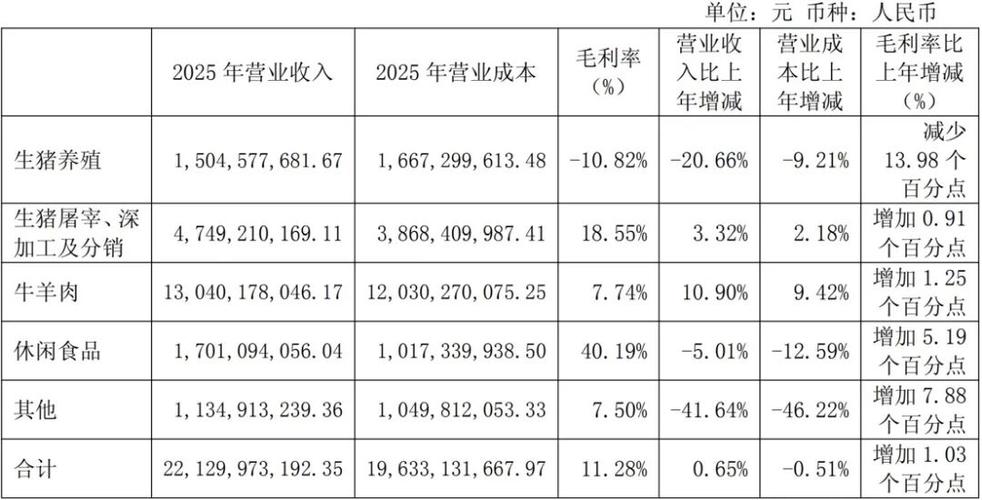 42- 2025-12-31 主营构成 主营收入(元) 收入比例 主营成本(元) 成本比例 主营利润(元) 利润比例 毛利率(%) 按行业分类 肉类食品 179.6亿 81.15% 166.5亿 84.82% 13.07亿 52.33% 7.28% 品牌食品 30.36亿 13.72% 19.31亿 9.84% 11.05亿 44.26% 36.40% 其他 11.35亿 5.13% 10.50亿 5.35% 8510万 3.41% 7.50% 按产品分类 牛羊肉 130.4亿 58.93% 120.3亿 61.28% 10.10亿 40.45% 7.74% 猪肉制品 34.14亿 15.43% 29.55亿 15.05% 4.594亿 18.40% 13.46% 休闲食品 17.01亿 7.69% 10.17亿 5.18% 6.838亿 27.38% 40.20% 生猪养殖 15.05亿 6.80% 16.67亿 8.49% -1.627亿 -6.52% -10.82% 罐头食品 13.35亿 6.03% 9.138亿 4.65% 4.214亿 16.88% 31.56% 其他 11.35亿 5.13% 10.50亿 5.35% 8510万 3.41% 7.50% 按地区分类 中国(含港澳台) 112.8亿 50.96% 96.50亿 49.15% 16.27亿 65.18% 14.43% 海外 108.5亿 49.04% 99.83亿 50.85% 8.694亿 34.82% 8.01%