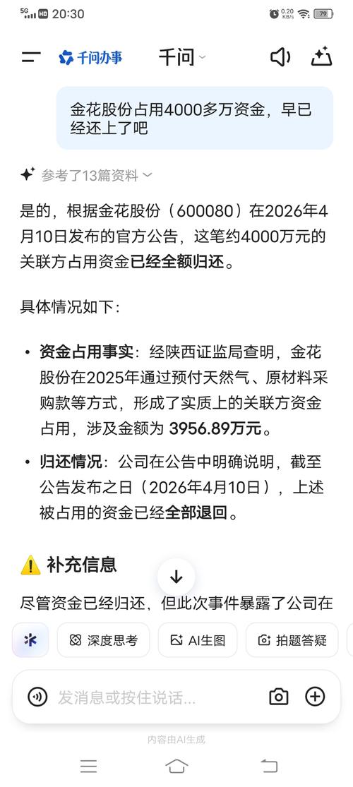 明天看看涨多少点,根据金花股份(600080)在2026年4月10日发布的官方公告,这笔约4000万元的关联方占用资金已经全额归还