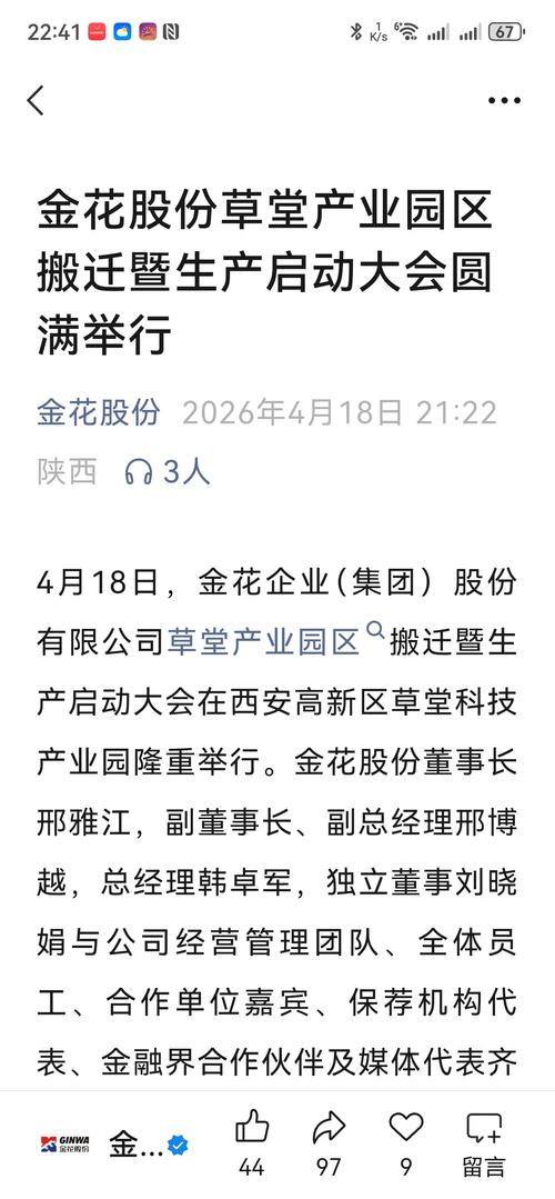 金花股份草堂产业园区搬迁暨生产启动大会圆满举行。 4月18日,金花企业(集团)股份有限公司草堂产业园区搬迁暨生产启动大会在西安高新区草堂科技产业园隆重举行。金花股份董事长邢雅江,副董事长、副总经理邢博越,总经理韩卓军,独立董事刘晓娟与公司经营管理团队、全体员工、合作单位嘉宾、保荐机构代表、金融界合作伙伴及媒体代表齐聚一堂,共同见证金花股份发展史上具有里程碑意义的重要时刻。2026/04/18扎根秦...