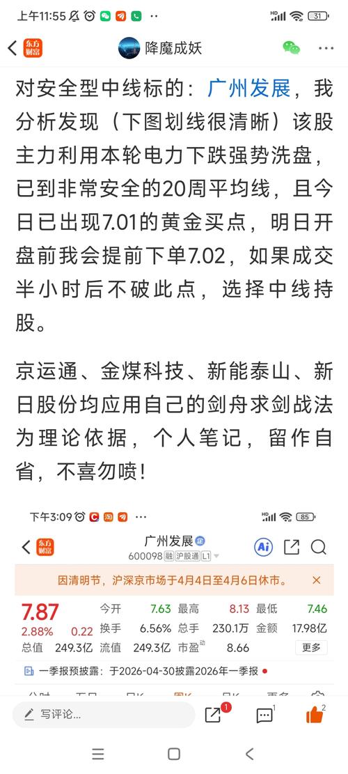 $广州发展(SH600098)$如果你留意过我4日1日发帖(附图),广州发展今早10:00站上20日线30分钟以上的安全买入信号也已出现了,你发现了吗? 以下是4月1号原帖: 降魔成妖 04-0116:16·甘肃 $新能泰山(SZ000720)$2026年3月份最后一个交易日盘后给自己留的作业(重在锻炼自己的判断力,完全没有指导股友操作的意思)切忌:我们的血汗钱不是大风刮来的!每个人的操作都应是自...