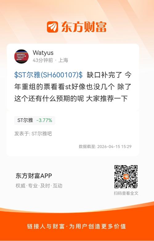 $ST尔雅(SH600107)$缺口补完了今年重组的票看看st好像也没几个除了这个还有什么预期的呢大家推荐一下
