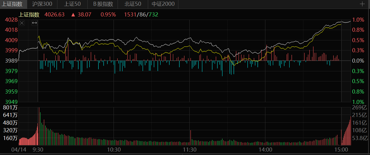 4月14日,A股三大指数集体高开,沪指开盘即站上4000点,创业板指续创阶段新高。午后盘面先抑后扬,创业板指涨幅一度收窄至1%以内,尾盘快速修复,三大指数均收于全天高点附近,全市场超3700只个股上涨。 截至收盘,上证指数涨0.95%报4026.63点,深证成指涨1.61%报14639.95点,创业板指涨2.36%报3558.53点,近5日累计涨幅达12.58%;科创50涨2.17%报1405.0...