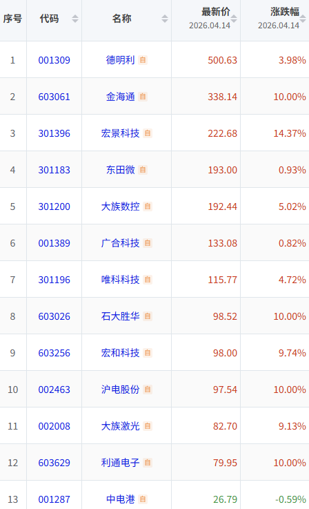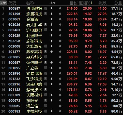 今日创业板再领风骚,涨2.36%,再创阶段新高。三大指数集体走强,较昨日放量2337亿。 从指数层面看沪指继续强势反弹,创业板形成突破走势,随着外围环境缓和,继续看多。但部分个股涨幅已较大,不建议追高。 票池涨幅 票池前20大涨数量持续增多,涨幅普遍较大,优质股做多力量很强。 从前20可以看出,算力租赁、PCB、半导体依旧领涨。 前期提示的$宏和科技(SH603256)$,今天尾盘开板,涨停不封板...