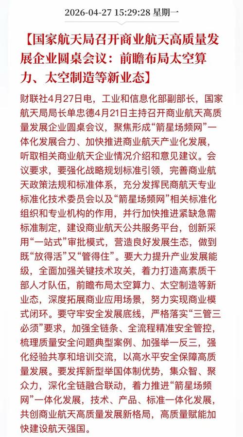 盘后航天来利好! 国家航天局召开商业航天高质量发展企业圆桌会议:前瞻布局太空算力、太空制造等新业态 4月27日电,工业和信息化部副部长,国家航天局局长单忠德4月21日主持召开商业航天高质量发展企业圆桌会议,聚焦形成“箭星场频网”一体化发展合力、加快推进商业航天产业化发展,听取相关商业航天企业情况介绍和意见建议。会议要求,要强化战略规划标准引领,完善商业航天政策法规和标准体系,充分发挥民商航天专业标...