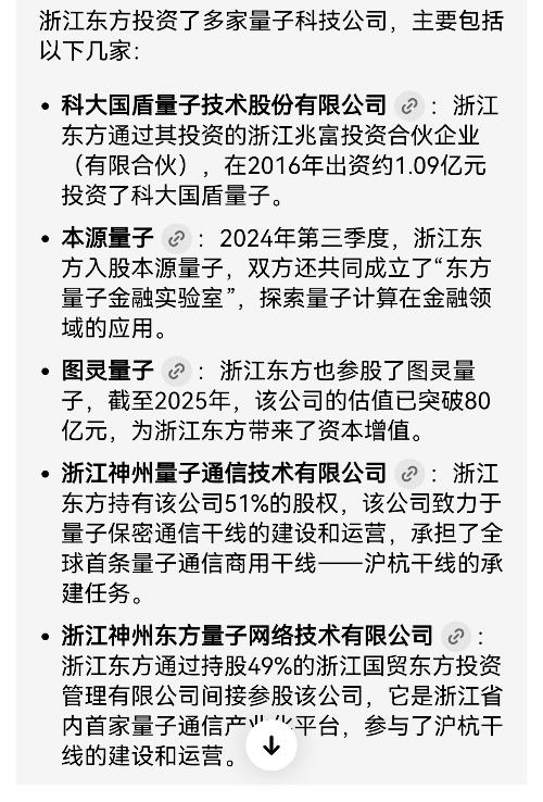 $浙江东方(SH600120)$公司向参股49%的参股公司浙江国贸东方投资管理有限公司了解,其旗下杭州兆富投资管理合伙企业(规模为5.669亿元,其中公司作为LP出资1.5亿元)出资4000万元投资了浙江神州量子网络科技有限公司、出资10850万元投资了科大国盾量子技术股份有限公司。神州量子目前主要从事量子通讯应用设备的开发和研究,尚未实现产业化生产,尚无盈利,后续盈利与否存在不确定性;科大国盾主...