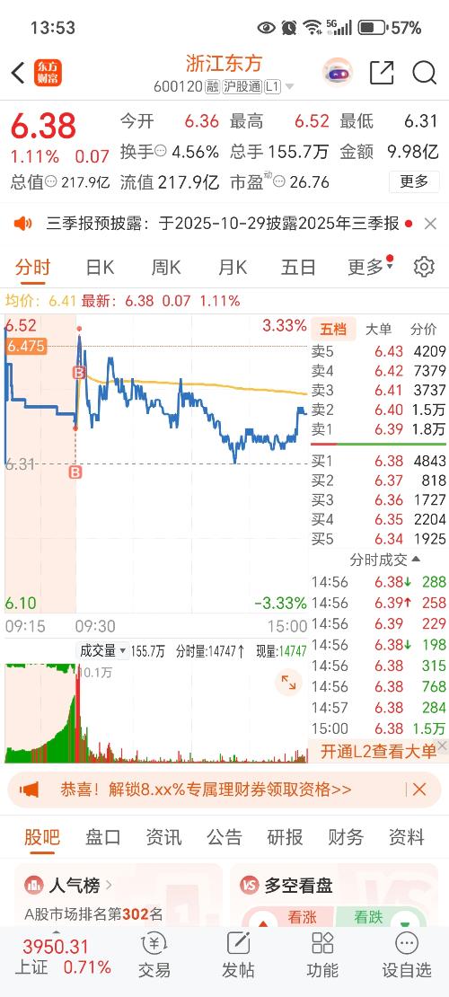 $浙江东方(SH600120)$大盘4千指日可待,轻轻松松的就上去了哈,让我们见证这牛逼的时刻哈哈哈,当然浙江东方也会随着这波潮流涌上你我心头,吃肉的时刻来了,接下来的量子科技是热门题材,十五五规划是国家重点项目扶持的项目。浙江东方的投资一定是有先见之明的必定是国企一定号召国家的政策实施执行,所以大方向没有任何问题,还是我之前说的6-7.5区间正当,站稳7.5就会突破上一个箱体也就是7-9.85区...