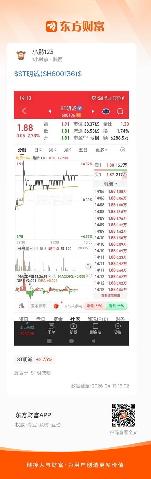 $ST明诚(SH600136)$可以理解是试盘。今天不用想涨停