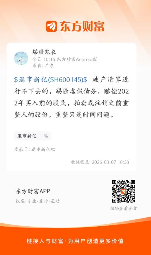 $退市新亿(SH600145)$破产清算进行不下去的,踢除虚假债务,赔偿2022年买入前的股民,拍卖或注销之前重整人的股份,重整只是时间问题。