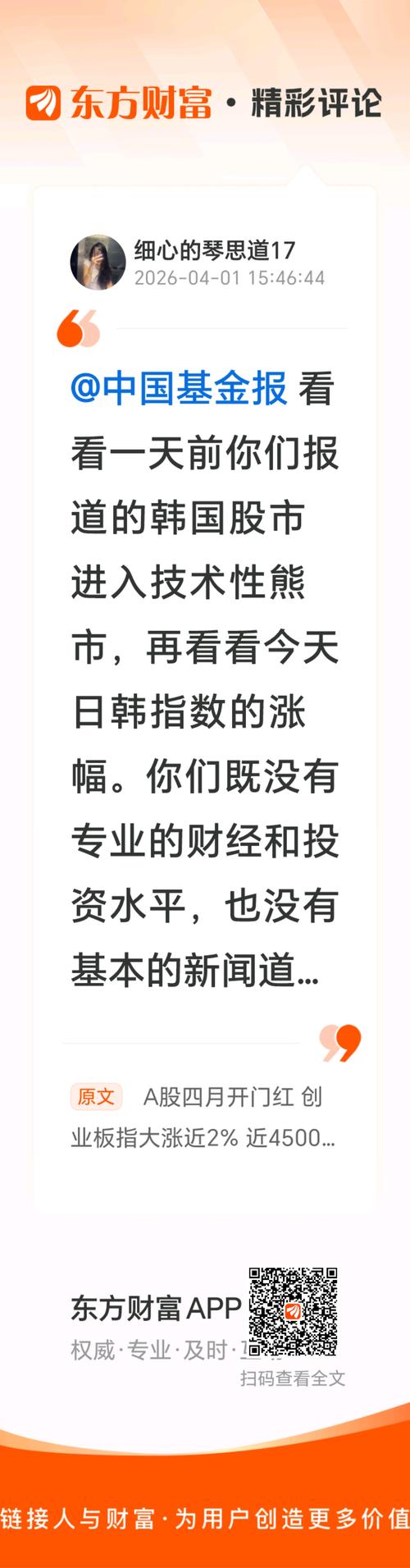 //@细心的琴思道17:@中国基金报看看一天前你们报道的韩国股市进入技术性熊市,再看看今天日韩指数的涨幅。你们既没有专业的财经和投资水平,也没有基本的新闻道德和底线,作为一个个体更是欺软怕硬的存在。你们不是喜欢写报道吗,我提三个问题你们敢写吗:a.一月份全市场成交量3万亿、做多情绪高涨时,是谁疯狂抛售两周、打压?b.我国作为本次美伊冲突的局外人,受到的影响最小,甚至在新能源等领域还受到利好,为何资...