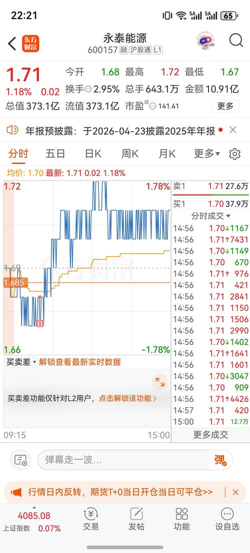 晚间话永泰能源:今日回顾与明日展望 今日回顾:早盘1.68元开,最高冲至1.72元,最低下探1.67元,最终收盘1.71元,上涨1.18%,单日振幅2.96%,股价全天运行区间集中在1.67-1.72元。全天成交量643.1万手,成交额10.91亿,换手率2.95%,量比1.14,资金活跃度较前一交易日提升;委比5.51%,买盘力量占优,内盘成交255.4万手,外盘成交387.7万手。个股所属电力...