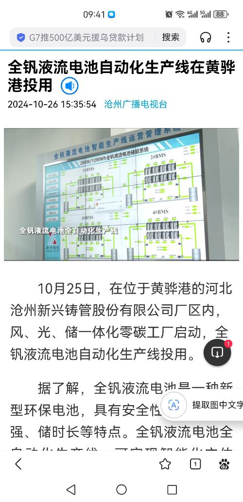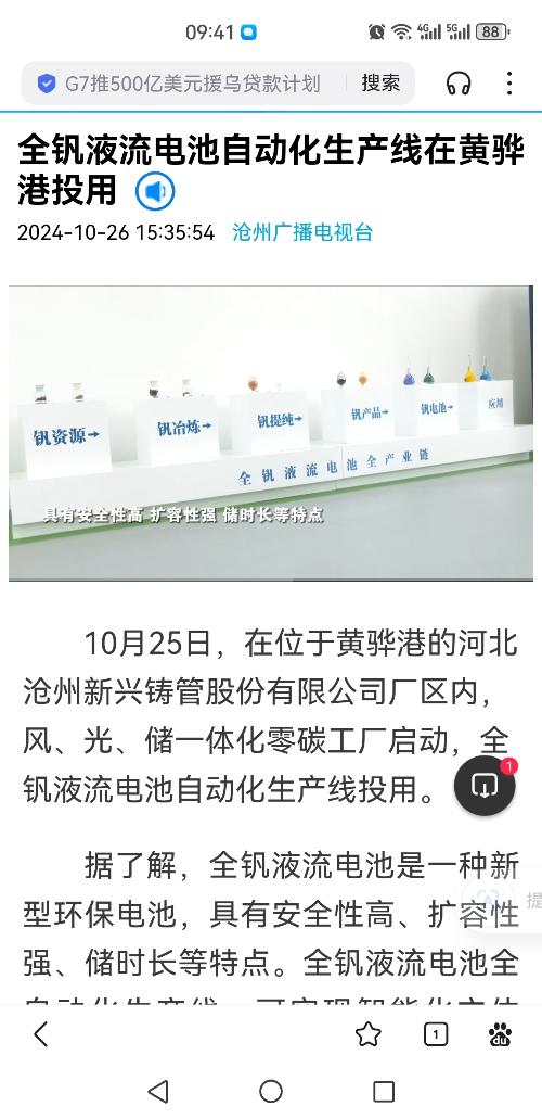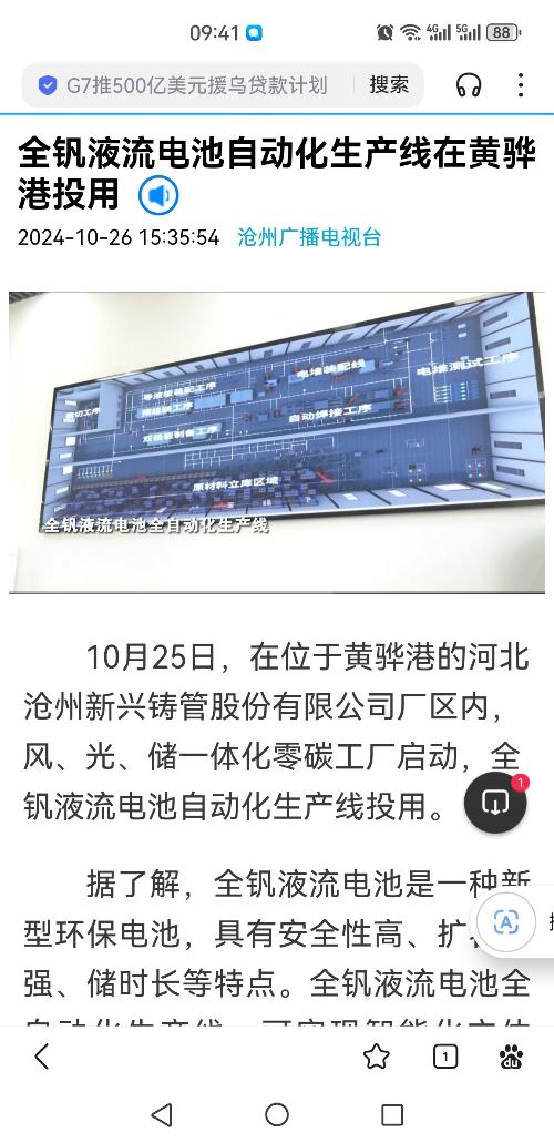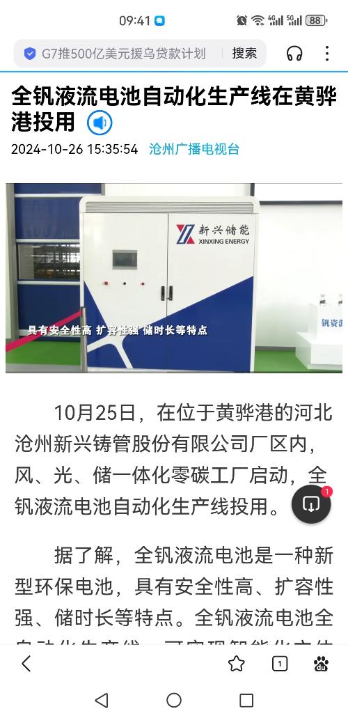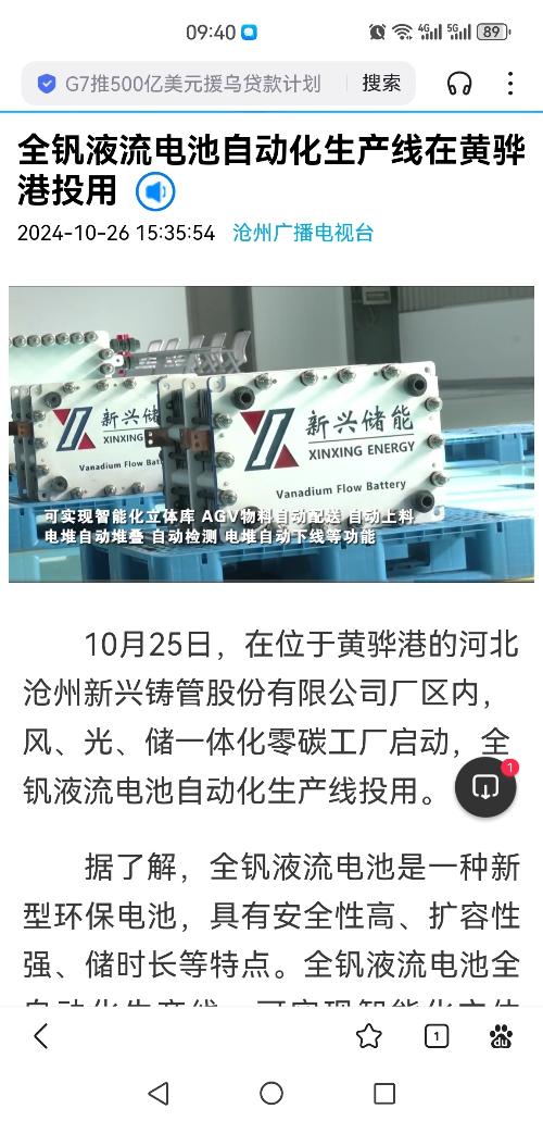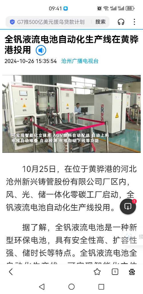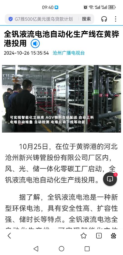 $永泰能源(SH600157)$$钛能化学(SZ002145)$$协鑫集成(SZ002506)$ 新兴铸管(000778)建成全国首条全钒液流电池全自动化生产线。