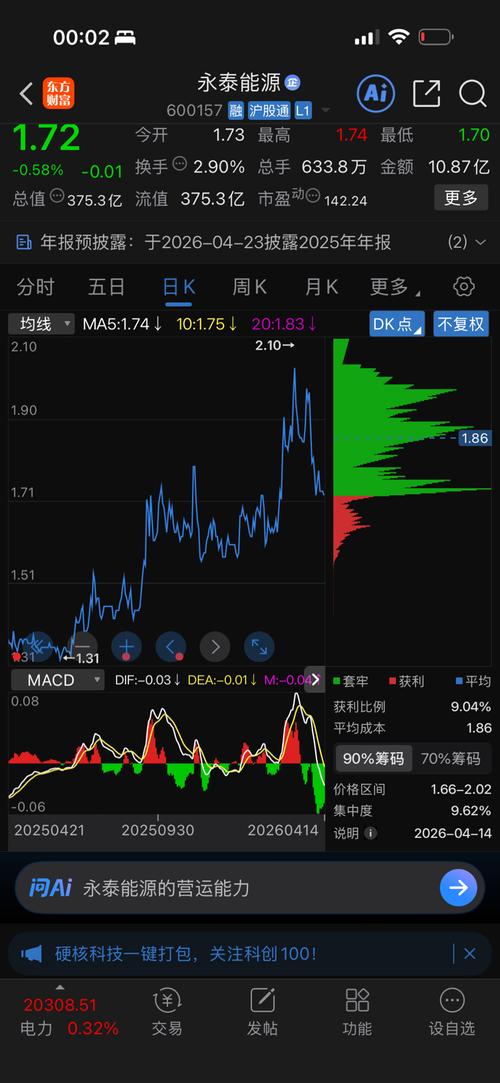 晚间话永泰能源:今日回顾与明日展望 今日回顾:早盘1.73元开,最高冲至1.74元,最低下探1.70元,最终收盘1.72元,下跌0.58%,单日振幅2.31%,股价全天运行区间集中在1.70-1.74元。全天成交量633.8万手,成交额10.87亿,换手率2.90%,量比1.01,资金活跃度较前一交易日有所持平;委比-4.11%,卖盘力量稍占优势,内盘成交380.2万手,外盘成交253.6万手。个...