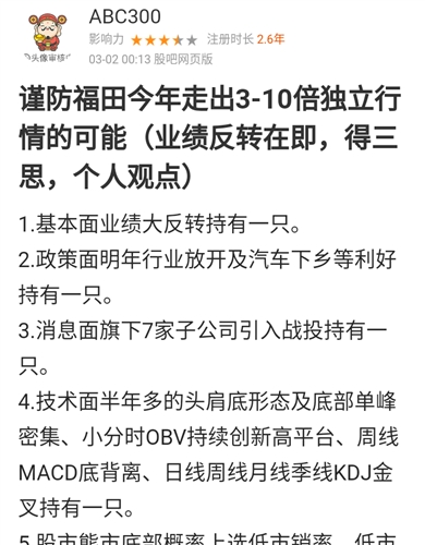 谨防一季报之前进入主升浪!理由有三:1.大盘牛市中,很难大幅度回调!2.福田技术面突破底部区域,各级别趋势共振概率大!3.福田销量业绩预期向好!~这个概率还是很大的!