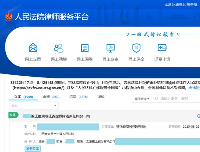 太原重工受损股民动态提醒,您的投资可能符合标准:2025年7月25日之前买入600169太原重工,且在2025年7月26日(含当日)之后卖出或继续持有者。以上索赔登记条件仅代表证威律所观点。不作为任何证券投资决策和买卖建议,最终以法院的认定结果为准。了解更多可网查证威律所企业信息