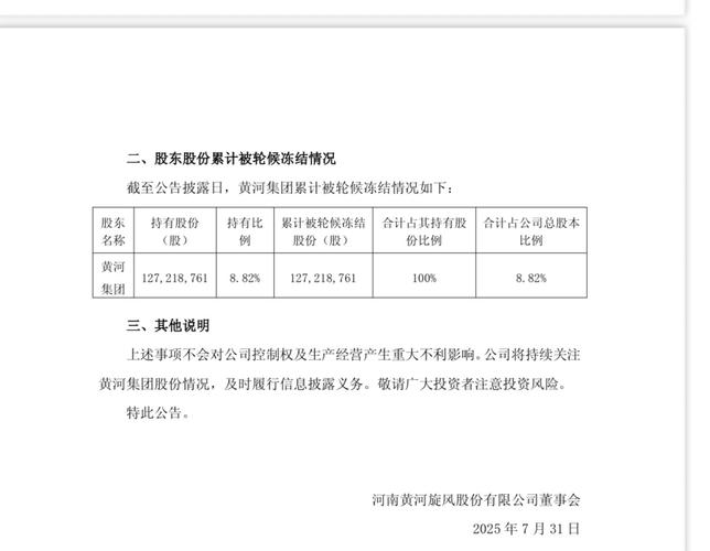 1.2024-05-10(临2024-025):司法标记+轮候冻结 -冻结对象:黄河集团(持股5%以上,非控股股东) -持股数量:127,218,761股(占总股本8.82%) -冻结情况:全部100%股份被司法标记及轮候冻结 -原因:江苏海安法院,票据纠纷(南通腾璨500万、海安德天典当200万) 次日涨幅-2.46%,7天涨幅:-3.5%,15天涨幅:-12.6%。 2.2024-10-01(...