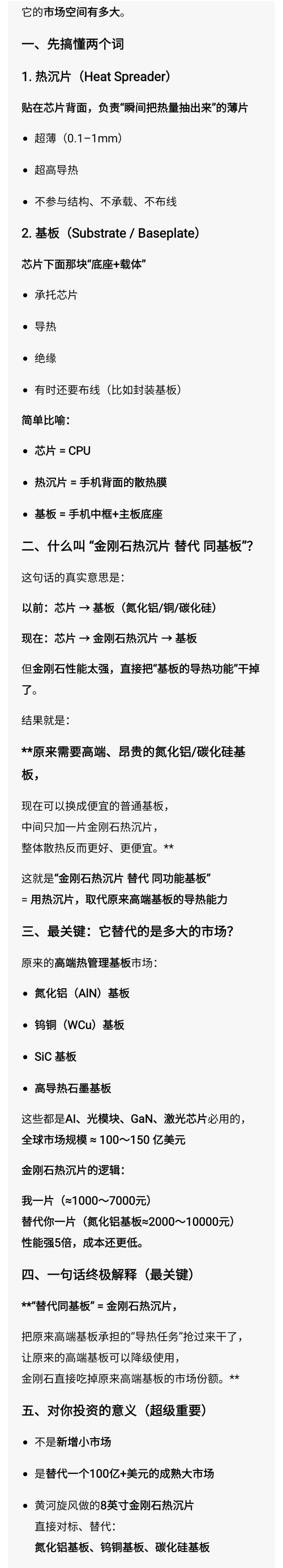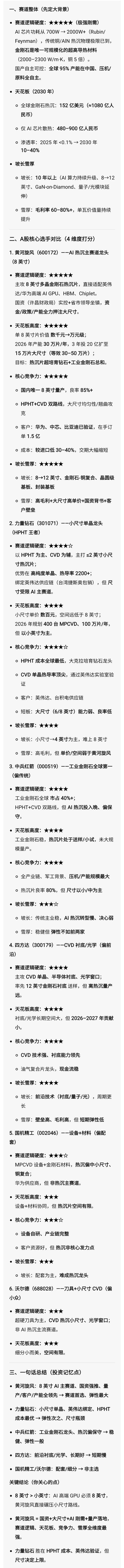 - 金刚石AI 散热全赛道公司对比都在这里了: 黄河旋风:8 英寸 AI 主赛道、国资强推、量产/客户/产能全领先 → 赛道首选、弹性最大 力量钻石:小尺寸单晶、英伟达绑定、HPHT 成本最优 → 弹性次之、尺寸瓶颈 中兵红箭:工业金刚石龙头、热沉偏保守→ 稳健、弹性一般 四方达:前沿衬底/光学、长期好 → 短期慢 国机精工/沃尔德:配套/细分 → 非主选 $四方达(SZ300179)$ $中兵红箭(SZ000519)$$力量钻石(SZ301071)$