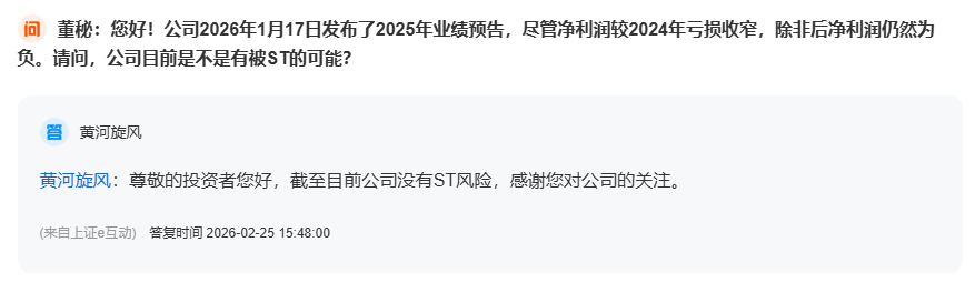49- 一、官方原话(上证E互动,2026-02-25) 问:公司2025年预亏,是否有被ST的可能? 答:截至目前公司没有ST风险。 二、依据(官方口径) - 时间:2026年2月25日(年报前、最新互动) - 渠道:上证E互动(交易所官方投资者平台) - 主体:黄河旋风董秘(公司官方) - 表述:直接、明确、无保留 —— “没有ST风险” 三、财务面支撑(不触发ST条件) 1.连续亏损但营收 ≫ 3亿:不触发“净利为负+营收<3亿” 2.2025预亏8.5亿,但净资产仍为正(约7亿+) 3.审计无非标风险(国资背书、历史无非标) 四、一句话结论 黄河旋风在官方平台已白纸黑字确认:公司无ST风险。