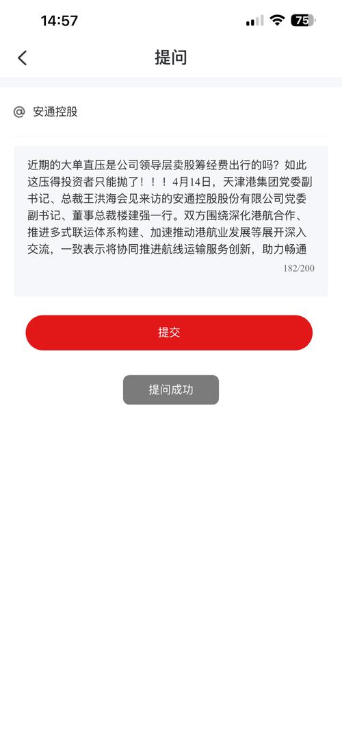 $安通控股(SH600179)$近期的大单直压是公司领导层卖股筹经费出行的吗?这压得只能抛了等低吸!!!4月14日,天津港集团党委副书记、总裁王洪海会见来访的安通控股股份有限公司党委副书记、董事总裁楼建强一行。双方围绕深化港航合作、推进多式联运体系构建、加速推动港航业发展等展开深入交流,一致表示将协同推进航线运输服务创新,助力畅通国内大循环,积极服务京津冀协同发展战略和现代化产业体系建设。天津港集...