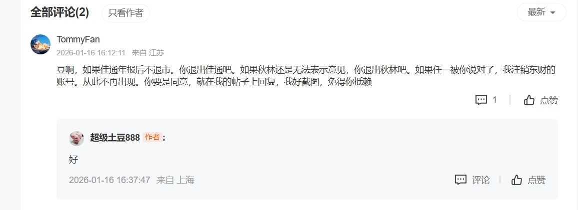 $S佳通(SH600182)$$秋林3(SZ400101)$豆啊。我再给你一次机会,你不是说你是逻辑严密,合理判断,不是造谣么?那么我认为佳通标准意见,秋林无法表示意见这个结论你到底跟不跟我打赌了?一月份我就说了,如果有一个我说的不对,我就注销账户,如果我都对了,不要求你注销账户,只要求你退出佳通吧,秋林吧。当时你也答应了,我也截图了。怎么临近年报日,你开始耍赖了?我再问下,能不能遵守承诺?你对你...