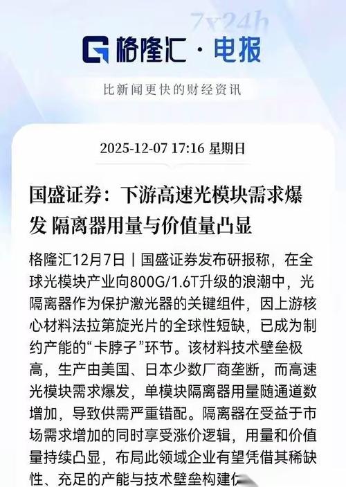 $光电股份(SH600184)$光电股份的宇航级GP材料量产优势和应用 典型的材料与工艺双重壁垒 隔离器的“心脏” 光通信环节中隔离器的“心脏”,隔离器是激光器的“单向阀”,核心功能是阻断反向反射光,保护昂贵的光源并确保信号完整性。在800G乃至1.6T的速率下,链路对反射光的容忍度明显收紧,隔离器的性能直接影响模块的稳定性和良率。