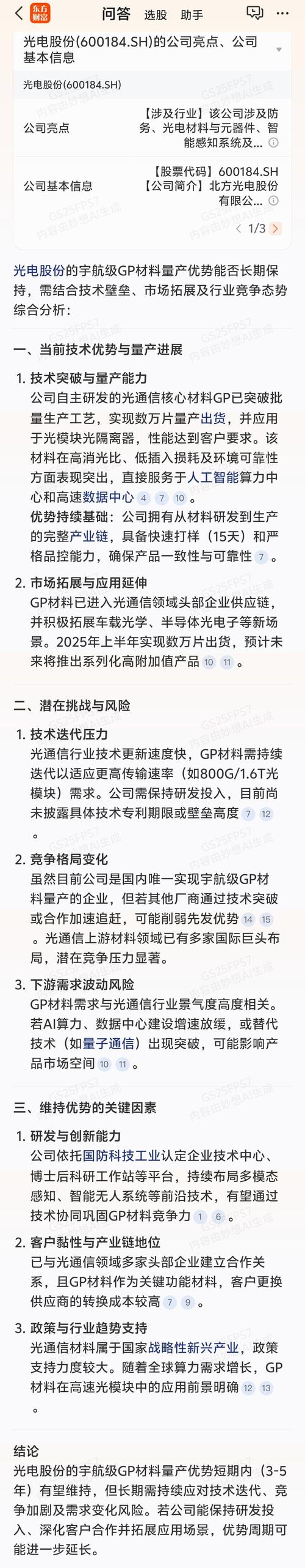 $光电股份(SH600184)$ 一、核心玻璃基板技术(半导体/光学领域) -产品定位:超低膨胀微晶玻璃基板、石英玻璃基板 -应用场景:半导体光刻、硬盘存储基片、光学检测基准 -技术壁垒: -国内唯一实现产业化 -纳米级抛光:表面粗糙度≤0.3nm(国际先进) -热膨胀系数极低、尺寸超稳定 -主体:由子公司湖北新华光研发生产 二、与显示玻璃基板(如彩虹股份)的区别 -光电股份(600184) -类...