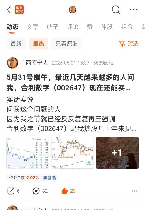 2025年05月31日15:37广西南宁人在$*ST仁东(SZ002647)$吧发过一贴 5月31号端午,最近几天越来越多的人问我,合利数字(002647)现在还能买吗 在这张贴子里广西南宁人特别强调 合利数字(002647)是我炒股几十年来见过的又一只零风险有暴利有钱途的股票 广西南宁人早已满融满仓卖车卖房全仓杀入合利数字(002647)坐等明年翻倍 为什么广西南宁人敢如此有信心说出如此狂妄之语...