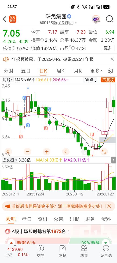 $珠免集团(SH600185)$还没跌到位置,应该在4.5左右才是低位,珠免以前叫格力地产,多次入场,最长持有2个半月,最高收益30%,这是一只靠等的股,每年有那么1、2次机会,大涨后,至少3-5个月是跌的