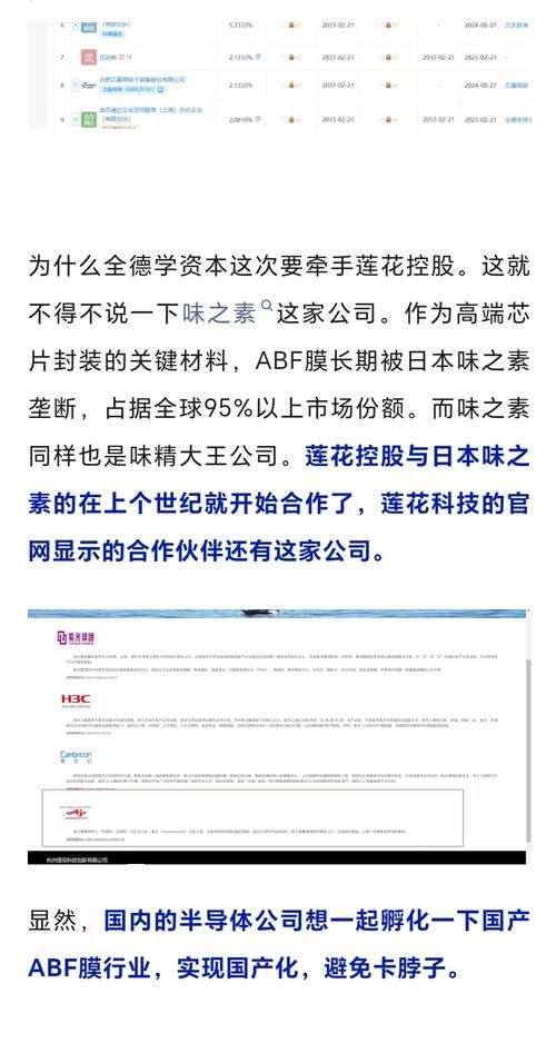 $莲花控股(SH600186)$兄弟们死死地拿住莲花控股,谁骗你也不要交筹码,调整就调整。国内GPU正在加速发展,实现国产替代。而卡脖子技术ABF膜会大量需求,日本味之素对我们现在是软限制,而更高端的(20层)不售卖我们,技术垄断,也是卡死我们向高端芯片发展的步伐。16层的增层膜目前只有华正和纽菲斯,华正快纽菲斯一步。20层增层膜华正正在验证,纽菲斯正在研发,还是快纽菲斯一步。不过纽菲斯材质上更贴...
