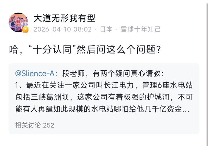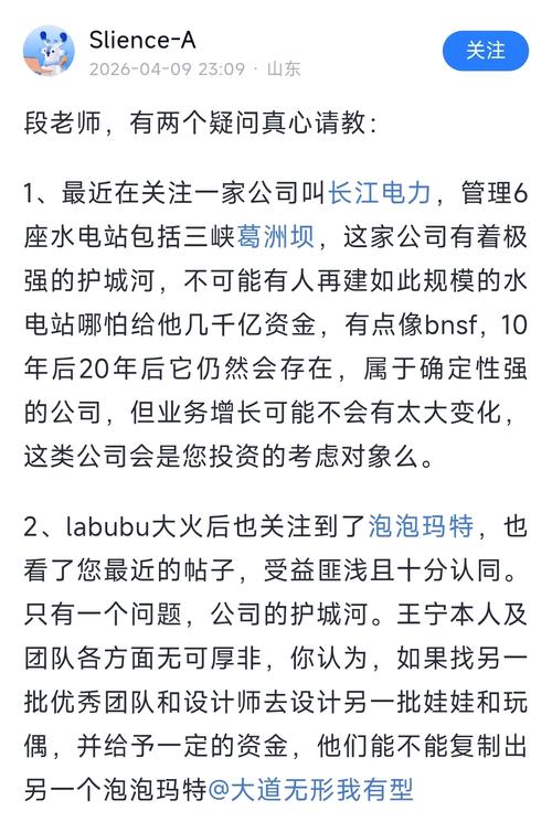 网友:段老师,有两个疑问真心请教: 1、最近在关注一家公司叫长江电力,管理6座水电站包括三峡洲坝,这家公司有着极强的护城河,不可能有人再建如此规模的水电站哪怕给他几千亿资金,有点像bnsf,10年后20年后它仍然会存在,属于确定性强的公司,但业务增长可能不会有太大变化,这类公司会是您投资的考虑对象么。 2、labubu大火后也关注到了泡泡玛特,也看了您最近的帖子,受益匪浅且十分认同。只有一个问题,...