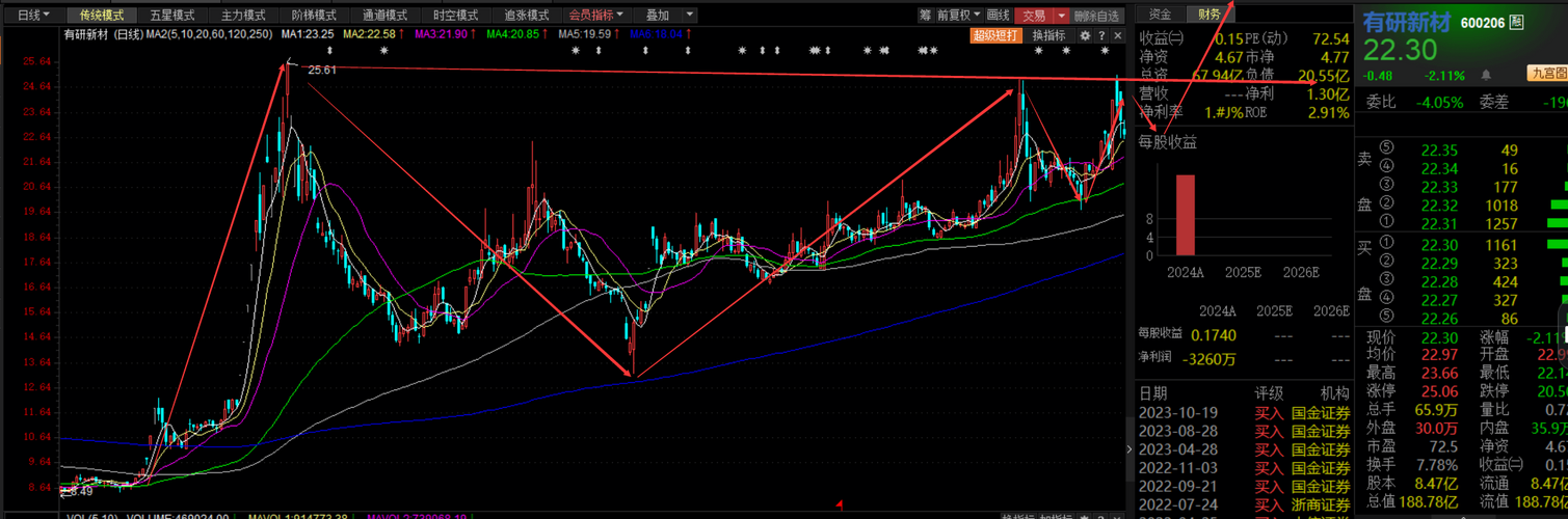 还得看大盘,大盘高开20点,有研有望涨0.40(四毛钱)。平开或低开,肯定绿了,绿4到5毛。
