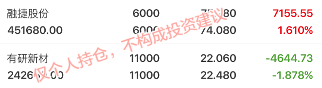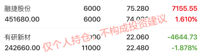 融捷股份: 我个人觉得作为锂矿头部企业,财务比较稳健,资产负债率较好。锂价反弹也带动股价回升,10日均线是强支撑,我个人会持续跟踪碳酸锂价格走势,目前短期来讲,我个人会继续持有。 有研新材: 高纯铜/钴靶材的国内头部,AI算力芯片核心耗材,国产替代空间还是比较大。有央企背景,政策支持。我个人认为目前股价走势稳健,波动小我会继续持有,等待半导体板块行情启动,我个人是比较看好国产替代。 持仓个股分析(...