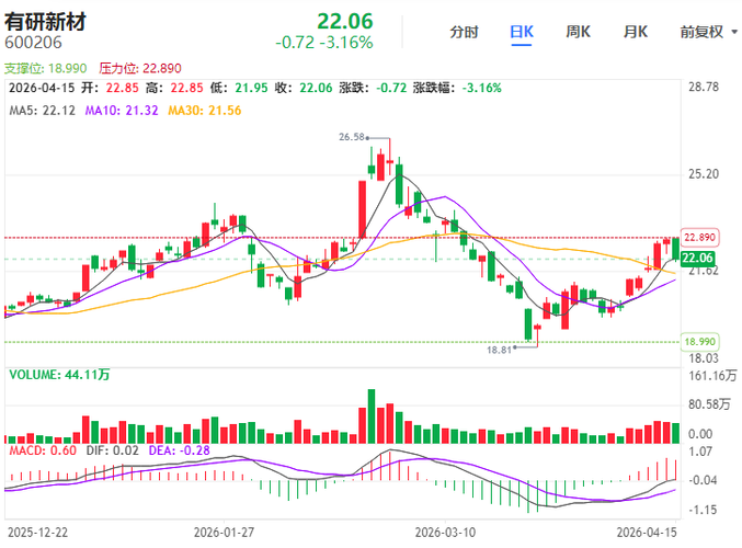 4月15日跌破5日线为短期获利回吐+稀土管制松绑情绪冲击,属上升途中的技术性回调。4月整体呈先抑后扬、震荡上行,年报(4.25)落地前在21.3–22.5元区间整固,年报披露后依托靶材高增+稀土业绩改善双主线,逐步挑战24–25元前期高点,中期看26–27元目标。 一、今日破5日线:短期信号与量价解读(4.15收盘) 1.关键数据 收盘价:22.06元(-3.16%) 5日线(MA5):21.97...