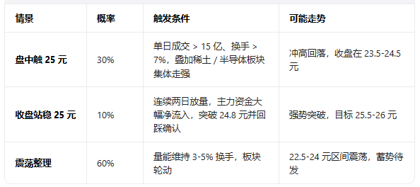 截至4月14日收盘22.78元,本周(3个交易日)收盘站稳25元概率极低(约10%);盘中短时触及25元概率中等(约30%)。核心障碍是短期量能不足+24-25元套牢盘重压,需强催化与放量突破。 一、五连阳形态与量能判断 五连阳结构:4月7-14日累计涨幅约12.2%,5/10/20日均线多头排列,短线趋势强势。 量能与换手: 4月7-11日:换手1.89%-4.73%,逐步放量,资金进场。 4月...
