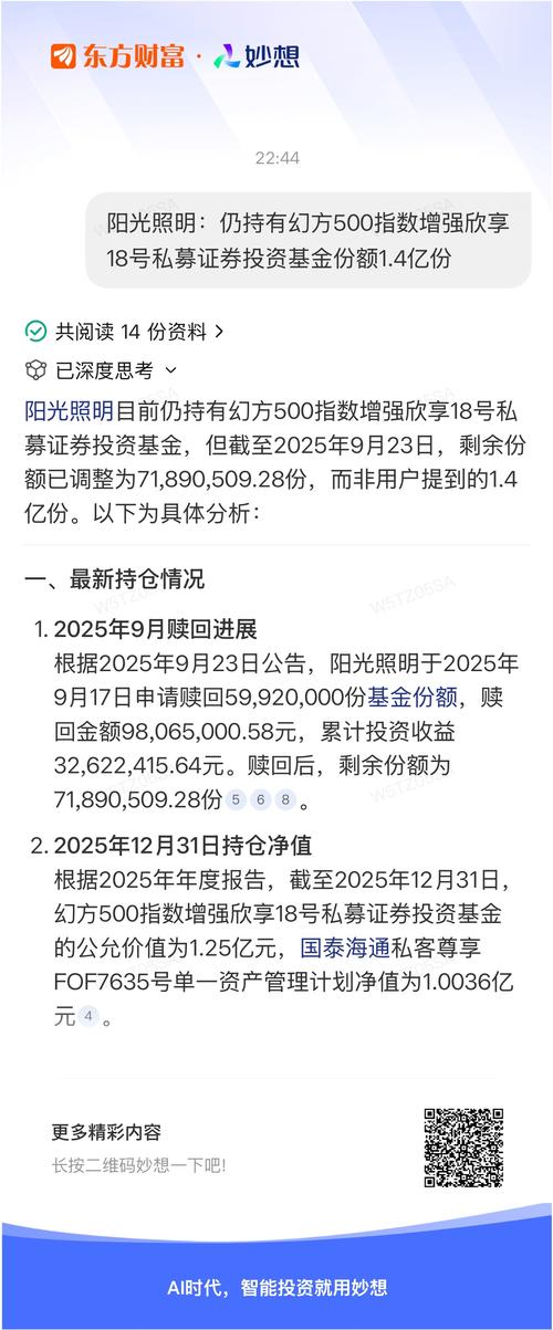 #@妙想,你怎么看?#妙想一下:阳光照明:仍持有幻方500指数增强欣享18号私募证券投资基金份额1.4亿份