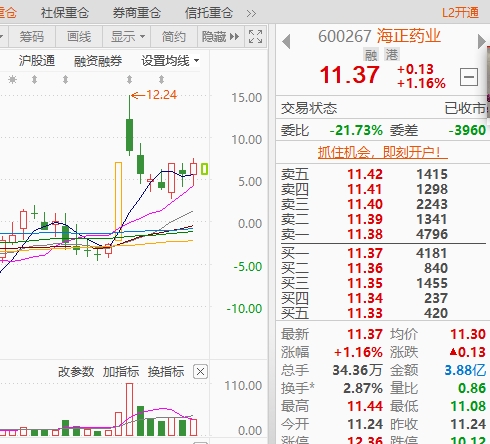 $海正药业(SH600267)$周五收盘,趋势多头行情中,主流净流入2418.35万元,散户资金流入173.82万元。散户尾盘又重新回流。 下周一,稍微小幅度高开,低走,横盘震荡,走鸡肋行情。但日线多头行情不变。 周线月线刚刚启动,预计6月份才是真行情。