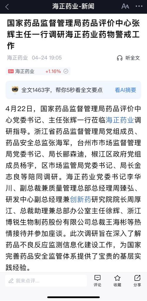 4月22日,国家药品监督管理局药品评价中心党委书记、主任张辉一行莅临海正药业调研指导。浙江省药品监督管理局党组成员、药品安全总监张海军,台州市市场监督管理局党委书记、局长郦森迪,椒江区政府党组成员杨宇,区市场监管局党委书记、局长金志良等陪同调研。海正药业党委书记李华川、副总裁兼质量管理总部总经理周臻弘、研发中心副总经理兼创新药研究院院长周厚江、总裁助理兼总部办公室主任徐辉、浙江博锐生物制药股份有限...