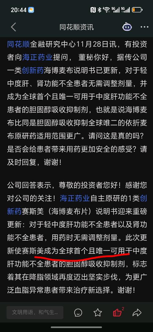 【问】董秘你好,据传公司一类创新药海博麦布说明书已更新,对于轻中度肝、肾功能不全患者无需调整剂量,并成为全球首个且唯一可用于中度肝功能不全患者的胆固醇吸收抑制剂,也就是说海博麦布比同是胆固醇吸收抑制全球唯二的依折麦布原研药适用范围更广。请问这是真的吗?是否会给患者带来用药更加安全的感受?请及时回复,谢谢!【答】海正药业:尊敬的投资者您好!感谢您对公司的关注!海正药业自主原研的1类创新药赛斯美(海博麦布片)说明书迎来重磅更新:对于轻中度肝功能不全患者以及肾功能不全患者,用药时无需调整剂量。此次更新使赛斯美成为全球首个且唯一可用于中度肝功能不全患者的胆固醇吸收抑制剂,标志着其在降脂领域再度迈出坚实步伐,为更广泛血脂异常患者带来治疗新选择。谢谢!