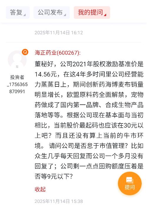 董秘您好:请问截止10月31日公司股东数量,谢谢 海正药业 海正药业:尊敬的投资者您好!为保证全体股东能够公平获取公司信息,公司已按照相关法律、法规和规范性文件的要求在定期报告中披露股东人数,敬请关注公司定期报告。感谢您的关注! (来自上证e互动)答复时间2025-11-2814:00:00 市场上那么多公司的董秘只要散户问股东人数就会回复相关数据,难道就是不公平,作为海正老股东,这么多年观察下来...