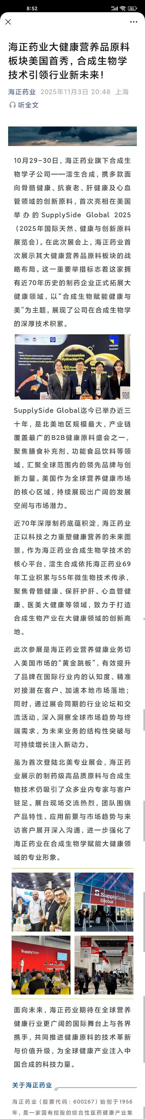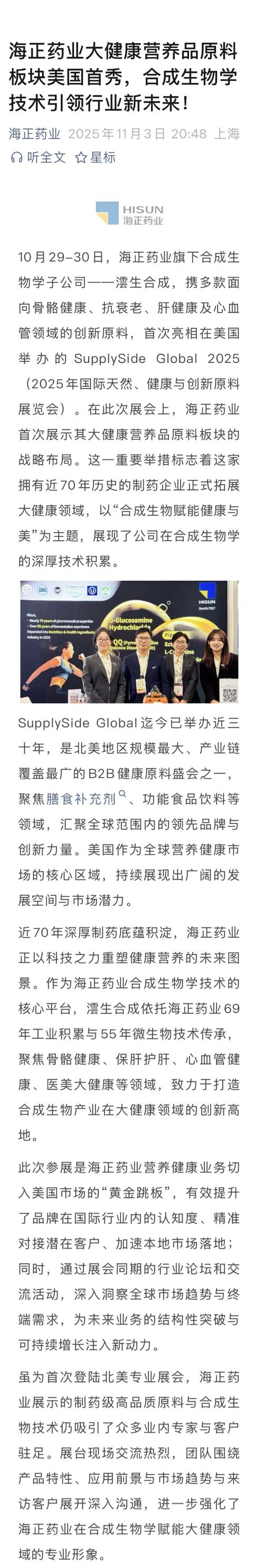 $海正药业(SH600267)$海正药业大健康营养品原料板块美国首秀,合成生物学技术引领行业新未来!